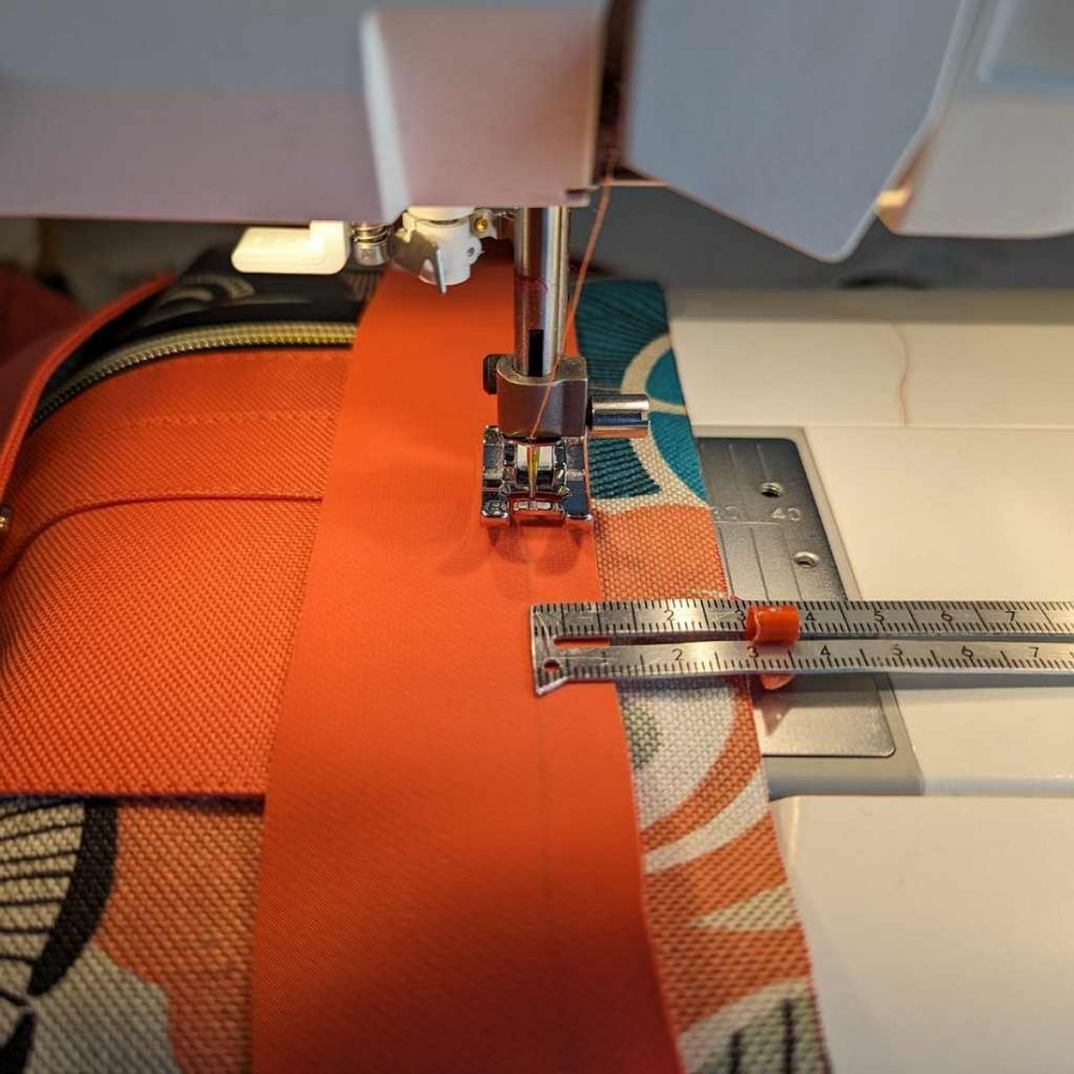 L’utilisation d’une petite réglette a été mon alliée pour coudre les bandes droites tout en respectant la marge de couture de 3 cm. En plaçant la réglette le long du tissu, j’ai pu maintenir une constance parfaite tout au long de la couture.